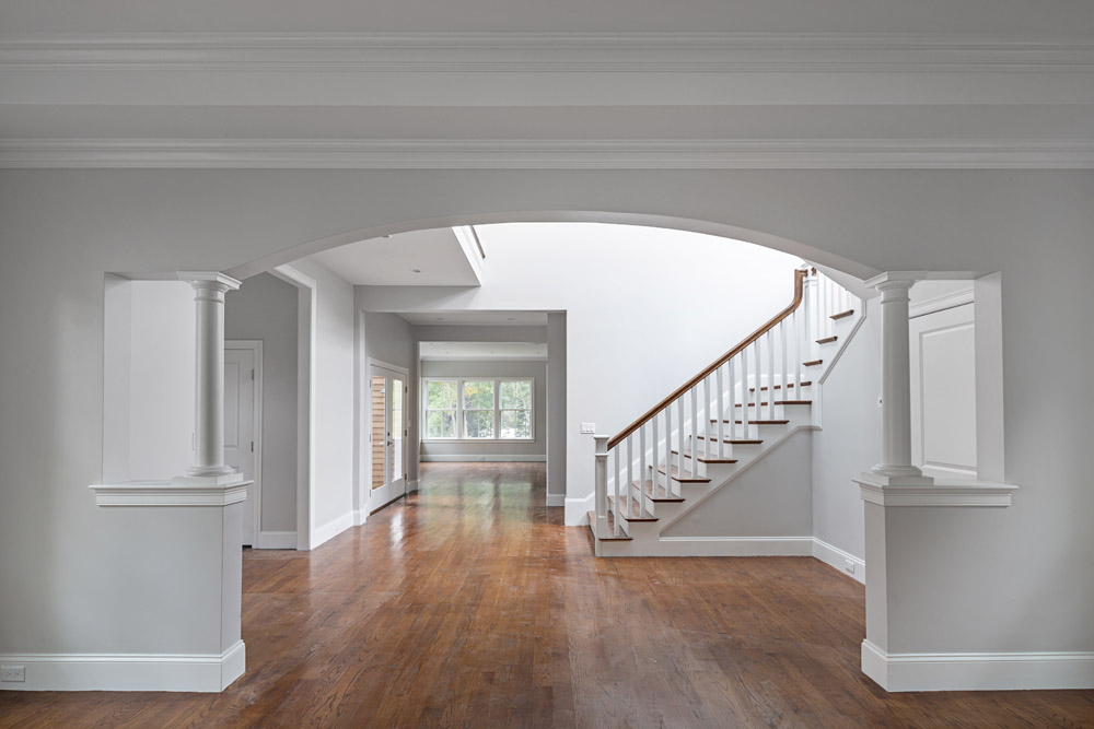 Embarc was commissioned to design a new single family house on an existing 11,600 SF lot in West Newton. The narrow constraints of the lot produced a ‘bar shaped’ building which was pushed well off the street into the middle of the deep lot. The modern design is playful with a spin on the traditional New England style home where pitched roofs were turned into dramatic, light filled double height volumes.
